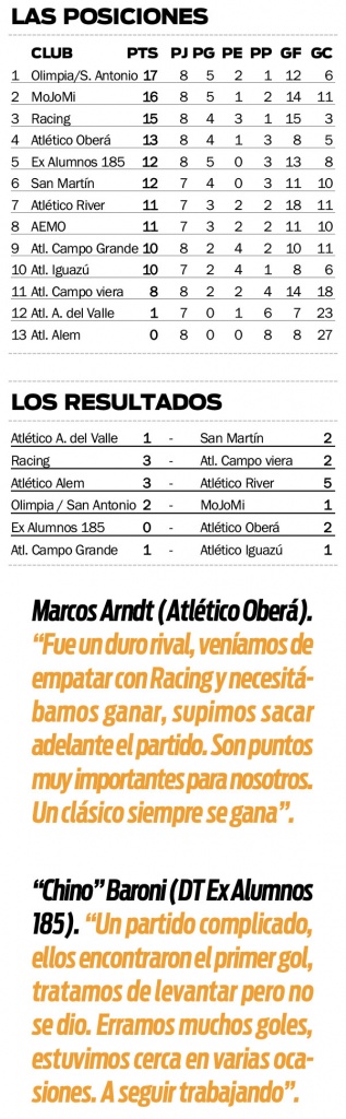 En la tarde del lunes se completó la octava fecha del Torneo Apertura 2019 “Roberto Beto Ferreyra” con la victoria 2-0 de Atlético Oberá por sobre Ex Alumnos 185 en una nueva edición del superclásico obereño. En otro resultado, Atlético Campo Grande y Atlético Iguazú empataron 1-1.