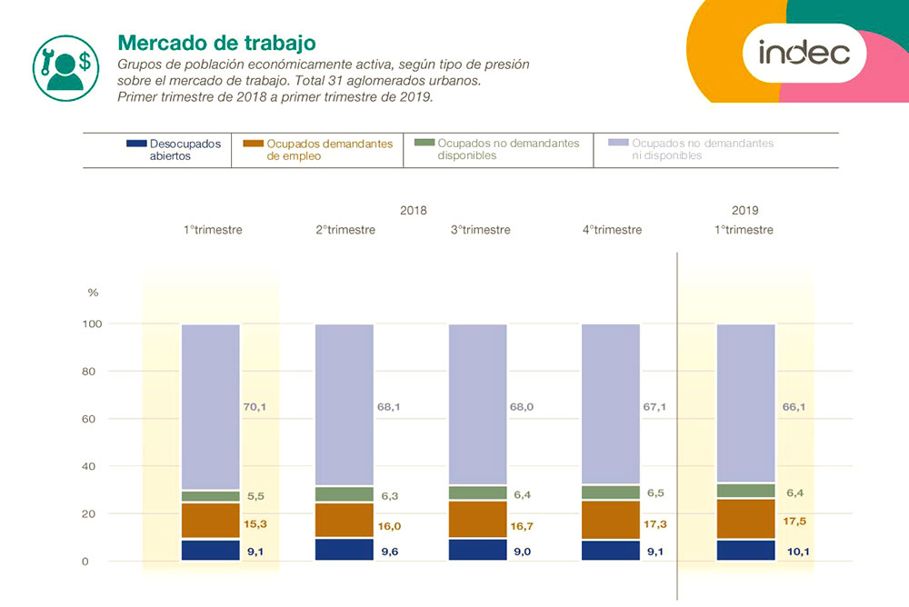 De acuerdo con el INDEC, en los 31 distritos relevados por el INDEC hay 1,3 millones de personas desocupadas y otras 1,5 millones subocupadas, con lo cual casi 3 millones de personas tienen problemas de empleo.