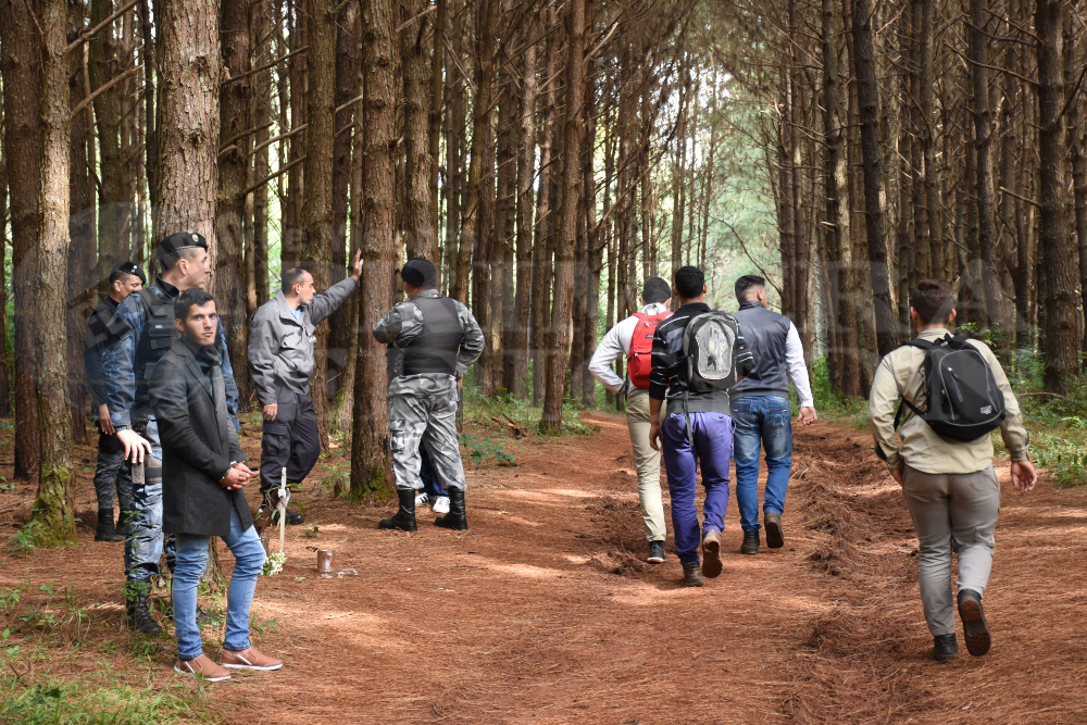 El Tribunal a pleno camino por el trillo ubicado a unos 250 metros del colegio y que se extiende unos 300 metros hasta el lugar donde la estudiante fue interceptada por sus victimarios, en medio de un pinar. Sólo le faltaban otros 500 metros para llegar a su hogar.
