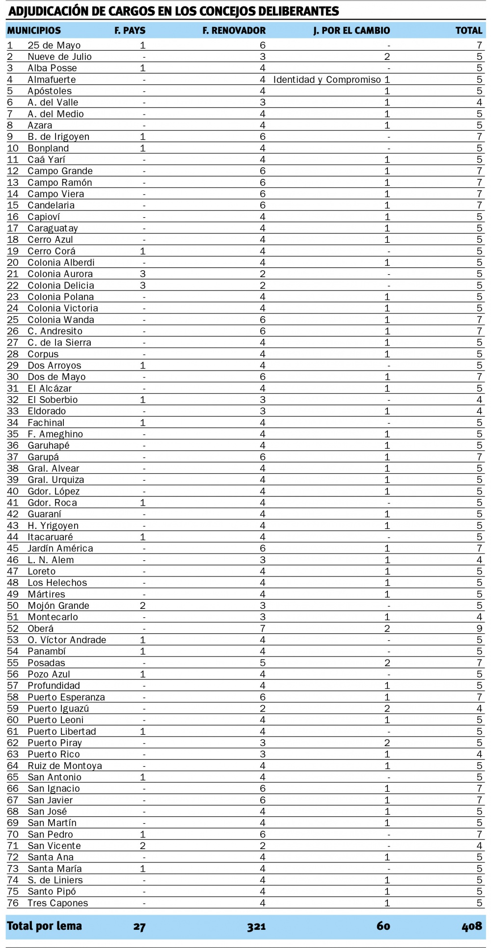 Sin embargo, el Tribunal Electoral de Misiones usó el criterio de otorgar una banca a la fuerza opositora que salió en segundo lugar, que en algunos casos fue Juntos por el Cambio y en otros el Frente Partido Agrario y Social (FPAyS).
