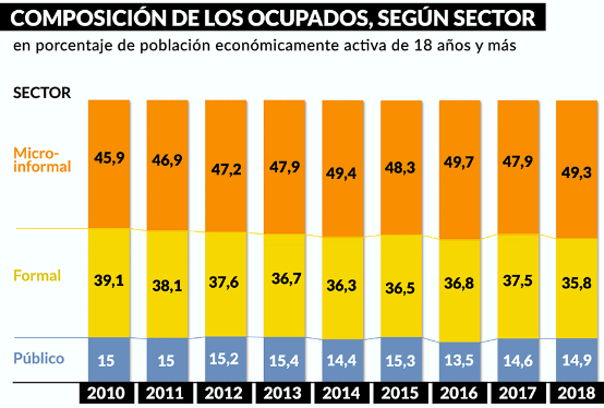 Según los resultados, referidos al tercer trimestre de 2018, sólo el 44,1% de la población económica activa de 18 años y más logró acceder a un empleo pleno de derechos.