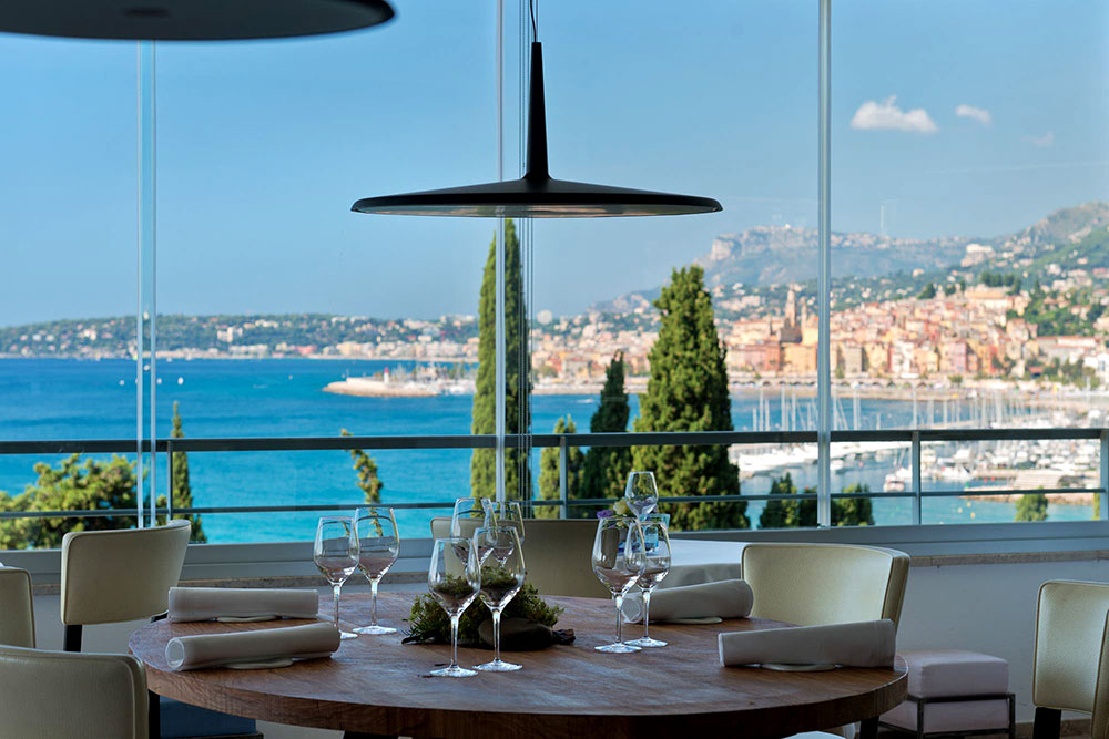Situado en la frontera con Italia y con unas vistas espectaculares sobre el Mediterráneo, Mirazur ofrece una cocina inventiva con ingredientes locales, que proceden en gran parte de los cinco huertos que Colagreco cultiva.
