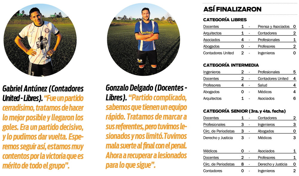 Mientras, en la zona de abajo, cumplieron Asociados y Profesores. El primero superó a Contadores, 2-0, con dos goles de Carlos Lezcano, mientras que los Profesores superaron a Profesionales, 2-1, con goles de Enzo Ostwald y Pablo Pritz Nilsson, Diego Escalante convirtió para Profesionales.