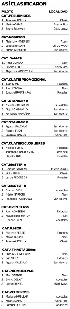 En la “B” el primer lugar fue para Agustín Kaleñuk de San Vicente. Mientras que en Cuatriciclos Libre, la victoria fue para Nicolás Febre de Posadas, por citar algunas de las categorías.