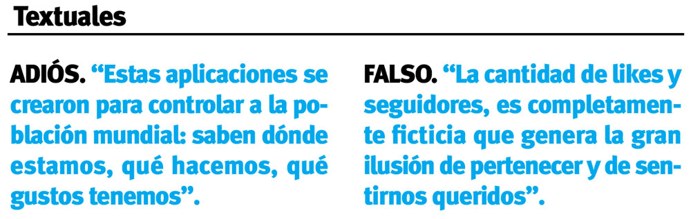Todos, de una forma u otra, promovemos o somos víctimas de esta nueva modalidad de comunicación donde las individualidades que nos distinguen comienzan a desdibujarse. “Estas aplicaciones despersonalizan porque nos incitan a seguir las conductas populares”, enunció Urien. “La vida privada se acabó. Estas aplicaciones se crearon para controlar a la población mundial: saben dónde estamos, qué hacemos, qué gustos tenemos”, dijo Abínzano.