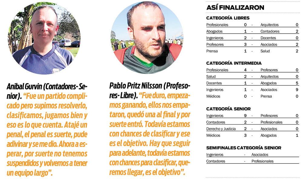 Ingenieros se quedó con el primer lugar, luego de golear a Profesores 9 a 0. Contadores superó a Profesionales 2 a 0, pero ambos consiguieron el pasaje a semis. Por el Grupo B, si bien Asociados cayó ante Derecho y Justicia por 2 a 0, al culminar con idéntica cantidad de puntos con el Círculo de Periodistas, teniendo en cuenta el partido entre ambos, donde Asociados había ganado a los comunicadores por 4 a 1, pasó a completar el cuadro de los cuatro mejores.
