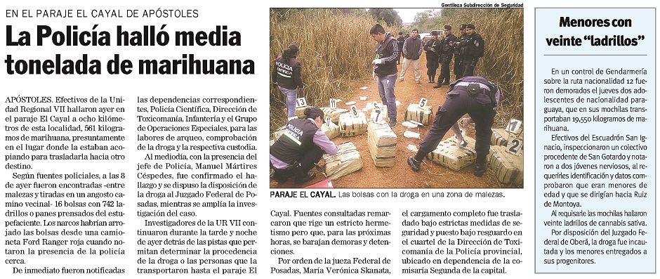 Dicho cargamento fue hallado el 8 de julio de ese año, en un camino vecinal ubicado entre los lotes agrícolas 143 y 144 zona Este de Apóstoles.