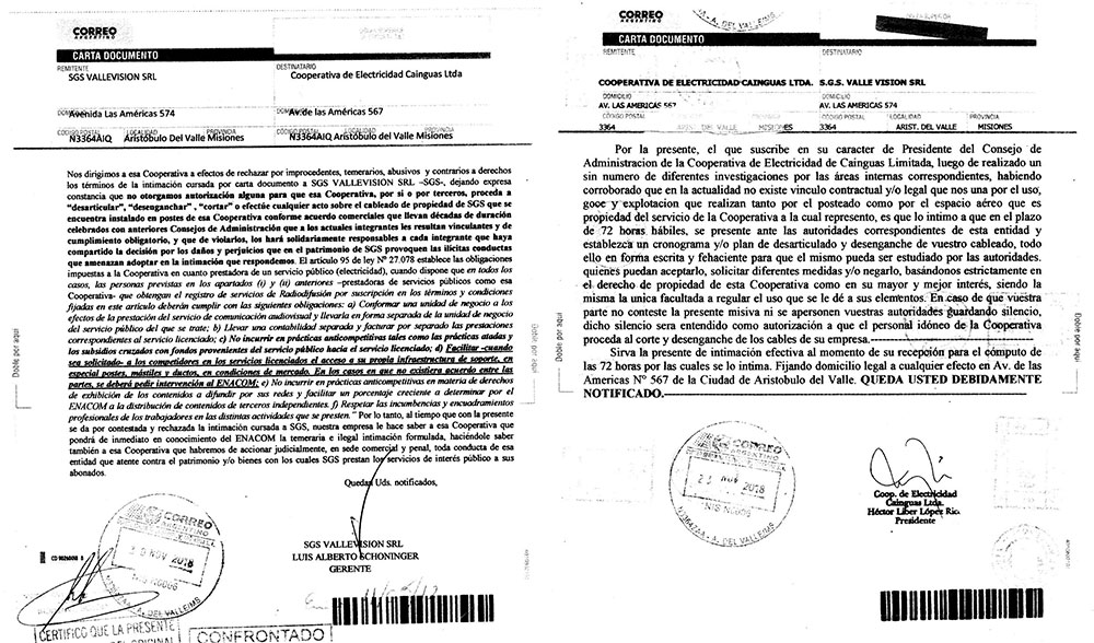 “Luego de haber realizado un sinnúmero de diferentes investigaciones por las áreas internas, habiendo corroborado que no existe vínculo contractual o legal que nos una por el uso, goce y explotación que realizan tanto por el posteado como el espacio aéreo que es propiedad de la cooperativa a la cual represento, es que lo intimo a que se presente ante las autoridades de esta entidad. Y establezca un cronograma o un plan de ‘desarticulado y desenganche’ de vuestro cableado”.