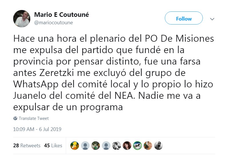 La noticia trascendió cuando el referente posteó en su cuenta de Twitter: “Hace una hora el plenario del PO de Misiones me expulsa del partido que fundé en la provincia por pensar distinto, fue una farsa, antes (Aníbal) Zeretzki me excluyó del grupo de WhatsApp del Comité local y lo propio lo hizo Juanelo del Comité del NEA. Nadie me va a expulsar de un programa”.