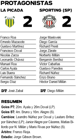 Con una muestra de carácter y unos retoques en el equipo, Sporting de Santo Pipó rescató un gran empate de 2 a 2 ante La Picada, que tuvo todo para liquidar pero que se durmió en la segunda mitad.