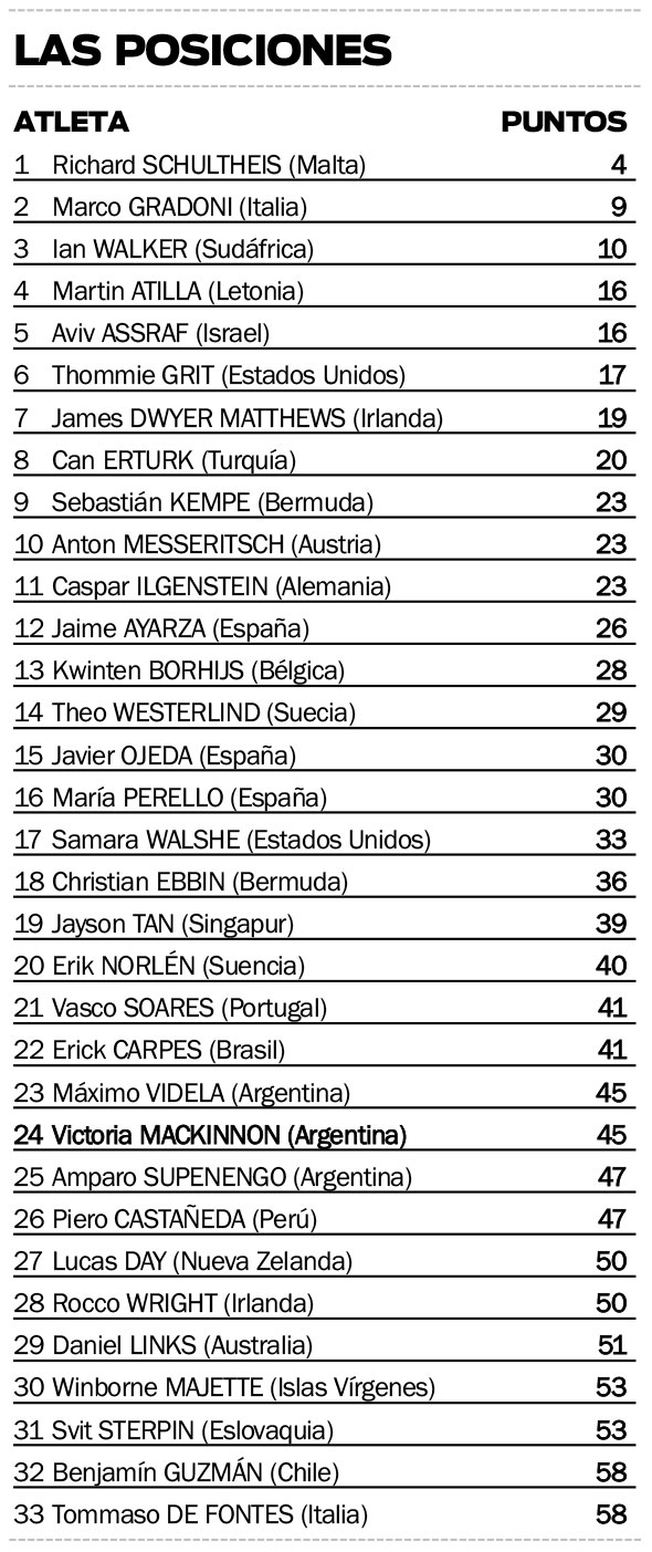 En el Mundial, los puntos que suma cada competidor tienen que ver con la posición que culminó en cada regata. Por ejemplo, en el caso de Mackinnon, acumula 45 unidades producto de la sumatoria de las posiciones en las que terminó en cada carrera (5, 13, 8 y 19). Claro que, a diferencia de la mayoría de los deportes, a menor cantidad de puntos la clasificación es mejor. Y al final del Mundial gana quien tenga menos unidades.