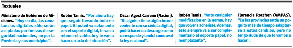 Florencia Rotchen, integrante de la Asociación Misionera de Productores Asesores de Seguro (AMPAS), también opinó al respecto ayer en el programa “El Aire de las Misiones”, donde advirtió que “estos son proyectos que los lanza la Nación y en las provincias por ahí cuesta un poquitito más que se implementen. A la hora de sacarte una póliza nueva, las compañías de seguros te pueden tomar los datos desde la cédula digital, es perfectamente factible; ahora, cuánto tiempo van a tardar los inspectores de tránsito en Misiones en decir que es 100% válido, no te lo puedo decir”.