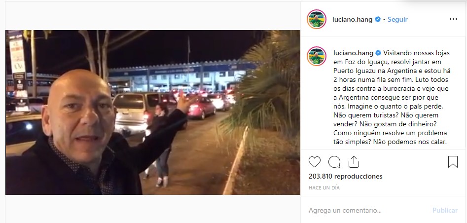 Este empresario con más de 120 tiendas diseminadas en distintos puntos del vecino país, recorrió Foz y en horas de la noche decidió cruzar la frontera para cenar en suelo argentino. Pero la demora de más de dos horas de cola que tuvo que realizar desataron su furia, y expresó su descontento a través de un video en Instagram, el cual rápidamente se viralizó debido a la cantidad de seguidores que posee.