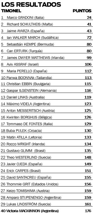 La joven posadeña, en dos regatas de ayer, culminó en los puestos 42º y 37º y cayó varios escalones en la tabla de la Copa de Oro, donde se encuentran los 60 mejores timoneles. Ahora se ubica en el puesto 40 con 176 puntos acumulados.