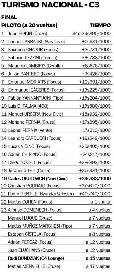 Justamente Pipkin, vencedor ayer, sumó puntos trascendentales en la lucha por el campeonato de la Clase 3, donde ahora marcha segundo, a solo cinco unidades del líder, José Urcera. La fecha en Oberá, a correrse el fin de semana del domingo 4 de agosto, puede resultar determinante en ese sentido.