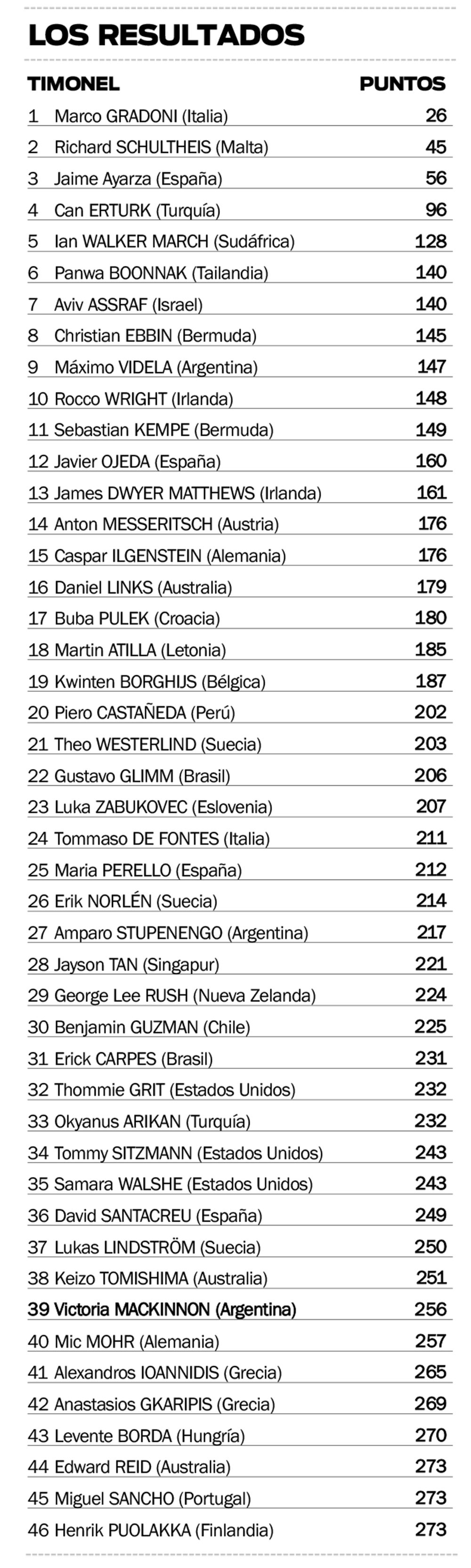 En la última jornada, Mackinnon no tuvo buenas regatas. En la primera carrera fue 47º, mientras que en la segunda terminó 39º. Así es como en el total de 12 regatas con las que contó el campeonato de individuales, “Charata” sumó 256 puntos que la ubicaron en la 39º posición de la clasificación general de la Copa de Oro. Es que la múltiple ganadora de la Fiesta del Deporte de PRIMERA EDICIÓN logró clasificarse a la máxima categoría de entre las cuatro en las que se dividió el certamen ecuménico en la competencia individual.