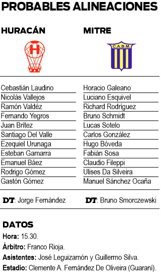 “Luego de todos estos días de incertidumbre, ahora nos queda dar vuelta la serie. Nosotros queremos jugar. Ellos son un equipo duro, bien parado y siempre competitivo”, especificó a este Diario el director técnico de Mitre, Bruno Smorczewski, quien perderá para hoy al lateral Juan Román por enfermedad (gripe) pero podrá contar con Manuel Sánchez Ocaña -tras una suspensión- en el ataque.