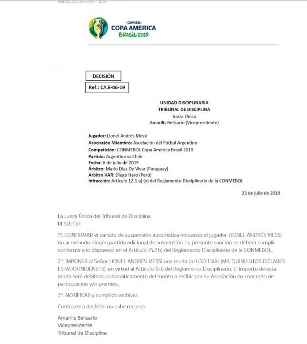 El Comité Disciplinario de Conmebol sancionó este martes por la noche con una fecha de suspensión y 1.500 dólares de multa al capitán de la Selección argentina Lionel Messi a raíz de su expulsión frente a Chile, en el encuentro por el Tercer Puesto de la Copa América 2019.