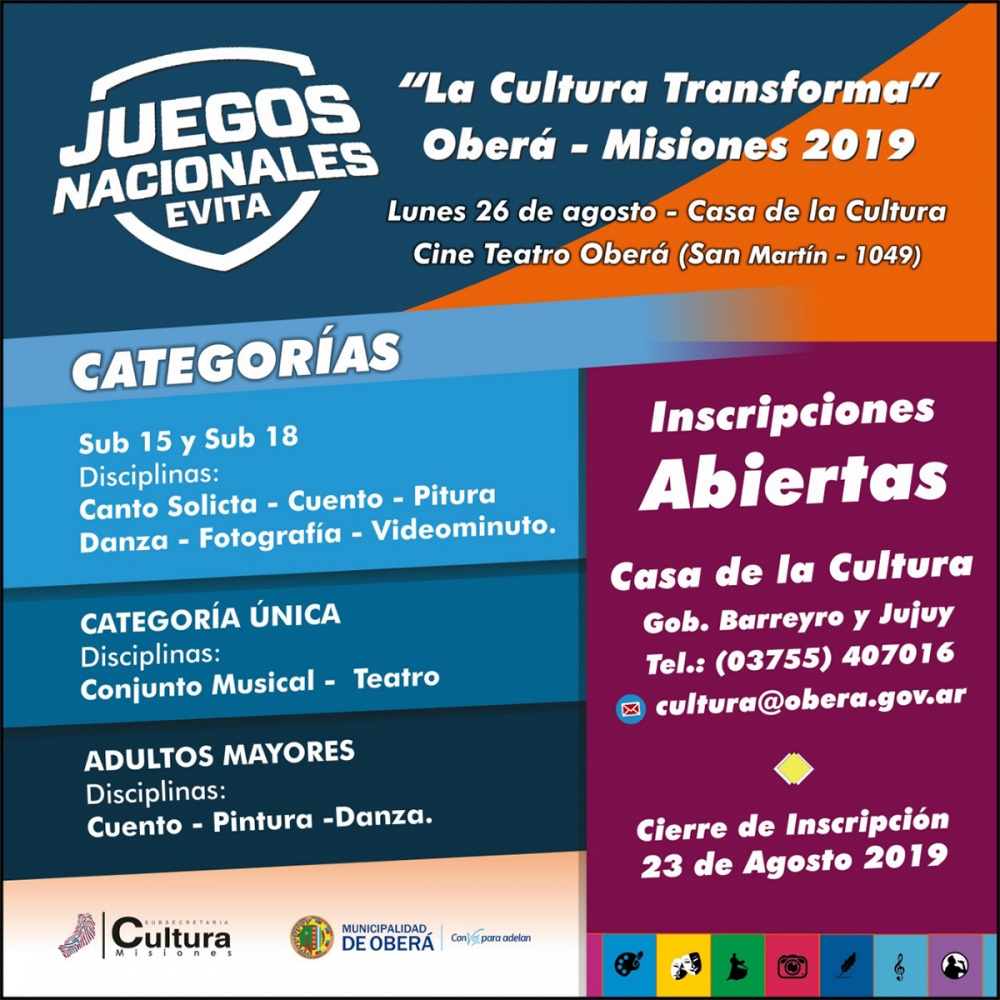 La participación está habilitada en las categorías Adultos Mayores de 60 (en Cuento, danza y Pintura) y Jóvenes, sub 15 y sub 18 (en Canto Solista, Cuento, Pintura, Danza, Fotografía, Videominuto, Conjunto Musical y Teatro).