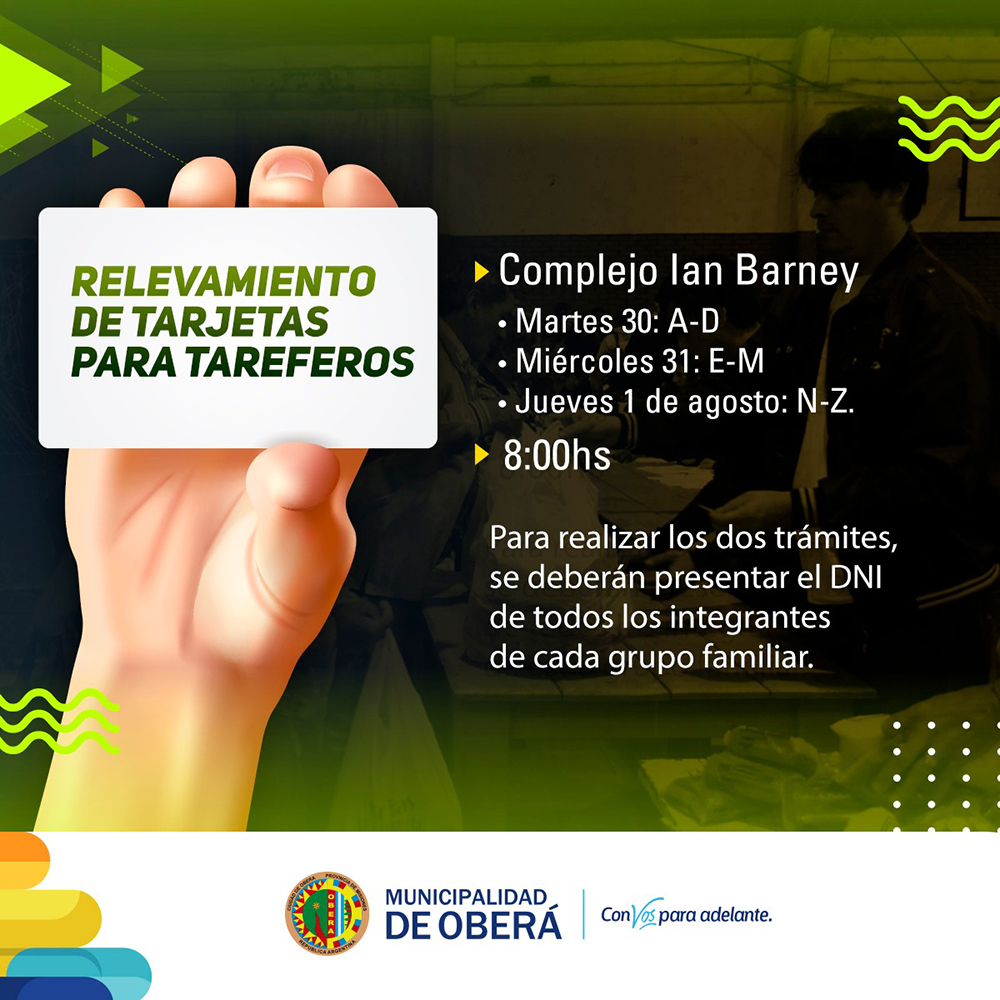 Para realizar los dos trámites, se deberán presentar el DNI de todos los integrantes de cada grupo familiar. Paralelamente, todos los tareferos que tengan recibo de sueldo, deberán presentarse para el censo 2019 que se realizará de manera simultánea. Cabe destacar que no se realizarán nuevas tarjetas ni incorporaciones a programas de asistencia.