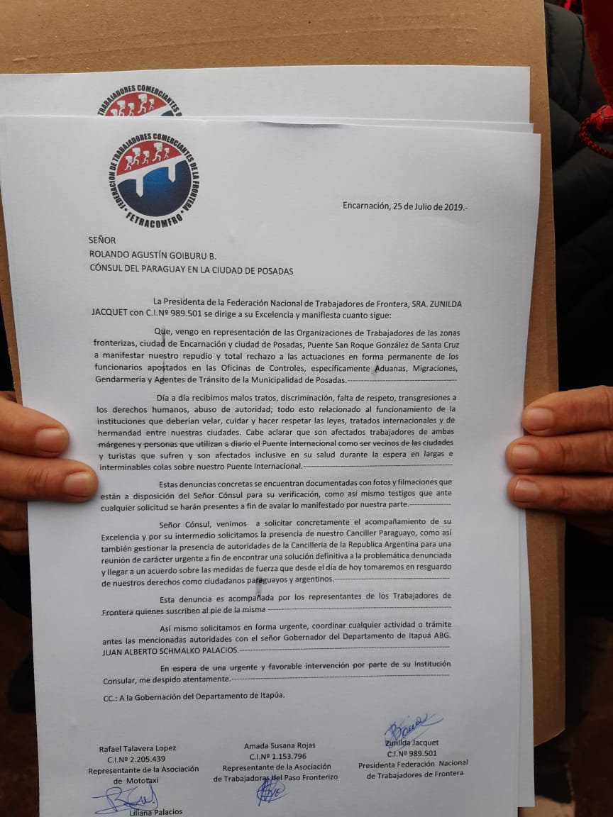 En una nota dirigida al cónsul paraguayo en la ciudad de Posadas, Rolando Agustín Goiuburu, los trabajadores del volante manifestaron su rechazo y repudio al accionar del personal del paso fronterizo apostado en las oficinas de controles de Migraciones, Aduana, Gendarmería y Agentes de Tránsito de la Municipalidad a quiénes acusan de “malos tratos, discriminación, falta de respeto, transgresiones a los derechos humanos, abuso a la autoridad”.