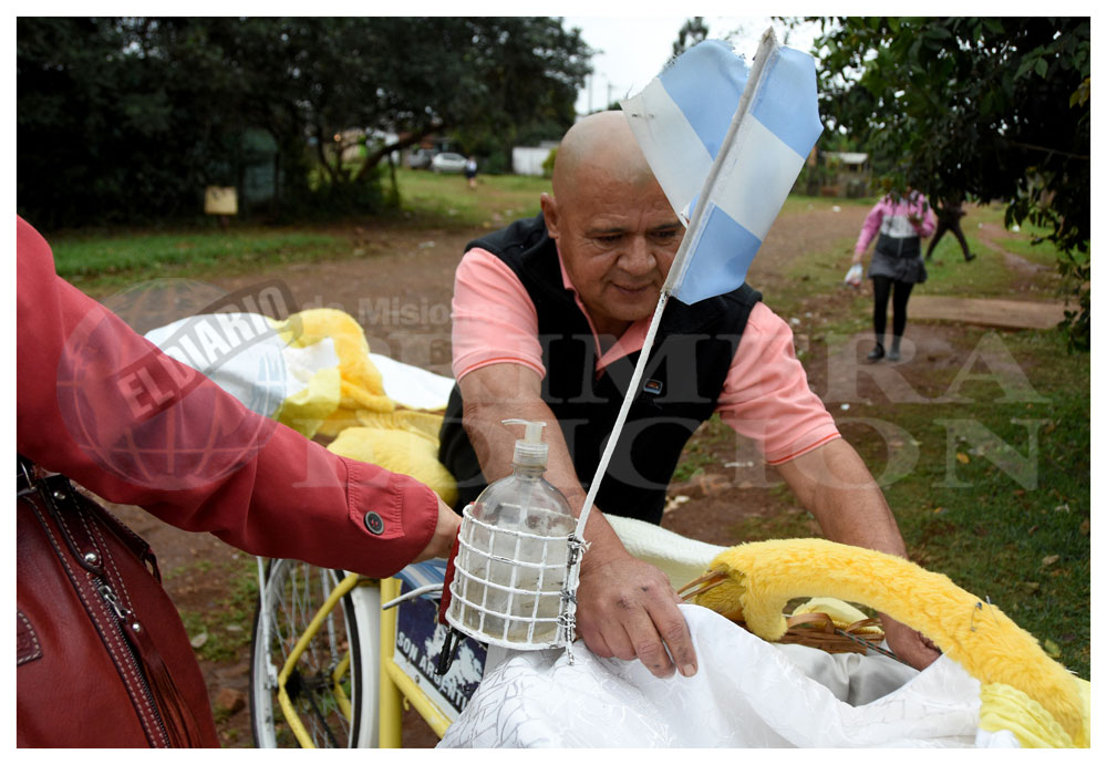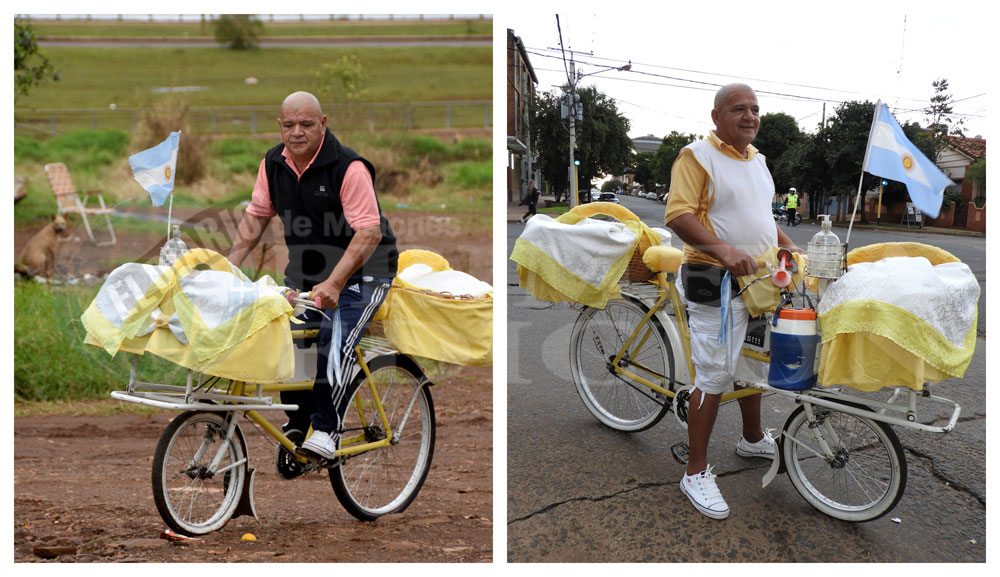Zamudio confió que siempre buscó ser diferente. Por eso decidió pintar su bicicleta de amarillo y blanco, y junto a su esposa, Rosa Franco, pensó en decorar los canastos. Y realmente se nota la diferencia. El rodado tiene un soporte donde el vendedor ubica el alcohol en gel y una toallita que utiliza a la hora de higienizar las manos. “Eso le gustó mucho a la gente que en la calle me para, me felicita, toma fotos”, dijo. Agregó que le contaron que “a la entrada a Buenos Aires hay un cartel donde está mi foto, haciendo propaganda de la chipa de Misiones. Una persona me pasó una imagen. Si bien tengo mucha curiosidad de ir a verlo, las obligaciones no me permiten porque con la venta estoy de lunes a lunes, a partir de las 4”.