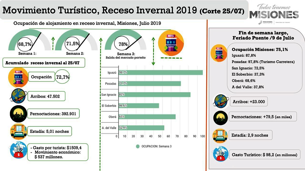 El promedio de estadía del turista se mantuvo en cinco noches “con lo cual se está sosteniendo el pernocte. Poder hacerlo en julio, tiene que ver con una articulación de los destinos, armando productos en forma conjunta entre San Ignacio, Moconá, Iguazú y Aristóbulo; la realización de fiestas y eventos como el TC que provocaron una ocupación del ciento por ciento”, evaluó el ministro de Turismo de la provincia.
