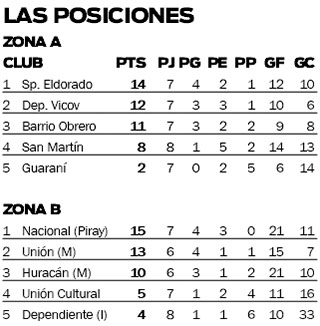 Por último, por la Zona B, Dependiente se despidió del certamen superando a la Unión Cultural y Deportiva Eldorado por 4-2. Silvio Ferreira, Mauro Rohden, Marcelo Noll y Gabriel Barboza marcaron para los de Irigoyen, mientras que Julio Mallorquín y Junior Acosta habían adelantado a los de Jona Pipke.