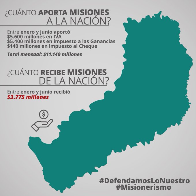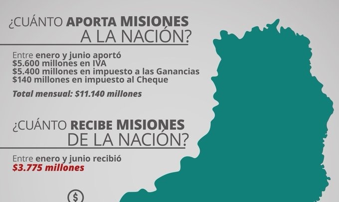 “Si nos fijamos en los números que no se centralizan en Buenos Aires, entre enero y junio Misiones aportó 5.600 millones de pesos en IVA; 5.400 millones de pesos en Impuesto a las Ganancias y 140 millones de pesos en Impuesto al Cheque (un promedio mensual de 11.140 millones de pesos). Y recibió de enero a junio un promedio de 3.775 millones de pesos”, puntualizó a través de su cuenta en la red social Twitter.