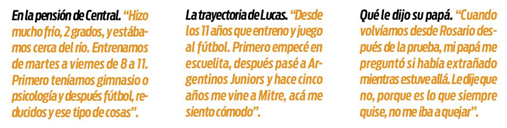 Lucas armó las valijas que desarmó aquella vuelta y esta vez sí, se fue hacia Rosario. Su papá lo llevó en su auto y se quedó con él toda la semana en un hotel fuera de la pensión. Lucas se dedicó a jugar al fútbol. “Llegué el lunes y de martes a viernes empecé con las pruebas. El entrenamiento era de 8 a 11. De 8 a 9 teníamos gimnasio o psicología. De 9 a 11 nos tocaba trabajo con pelota, reducido y esas cosas”.