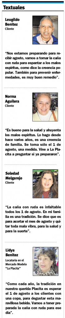 El próximo jueves comienza agosto y hay que “espantar a los malos espíritus”. Porque, como dice Secundina Acosta (82), una conocida vendedora en los puestos del Mercado Modelo La Placita,“julio los prepara y agosto se los lleva”. Por eso, hay que tomar caña con ruda.
