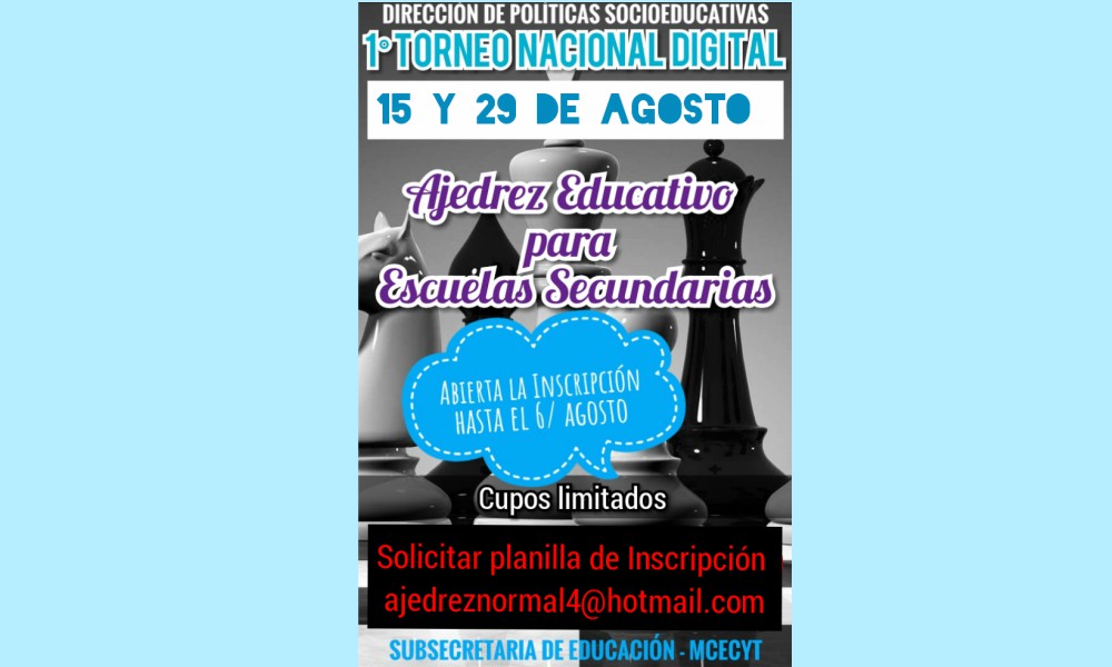 El Ministerio de Educación, a través de la Subsecretaría de Educación, informa que hasta el 6 de agosto se encuentra abierta la inscripción para quienes deseen participar del 1° Torneo Nacional Digital de Ajedrez Educativo para Escuelas de Nivel Secundario.