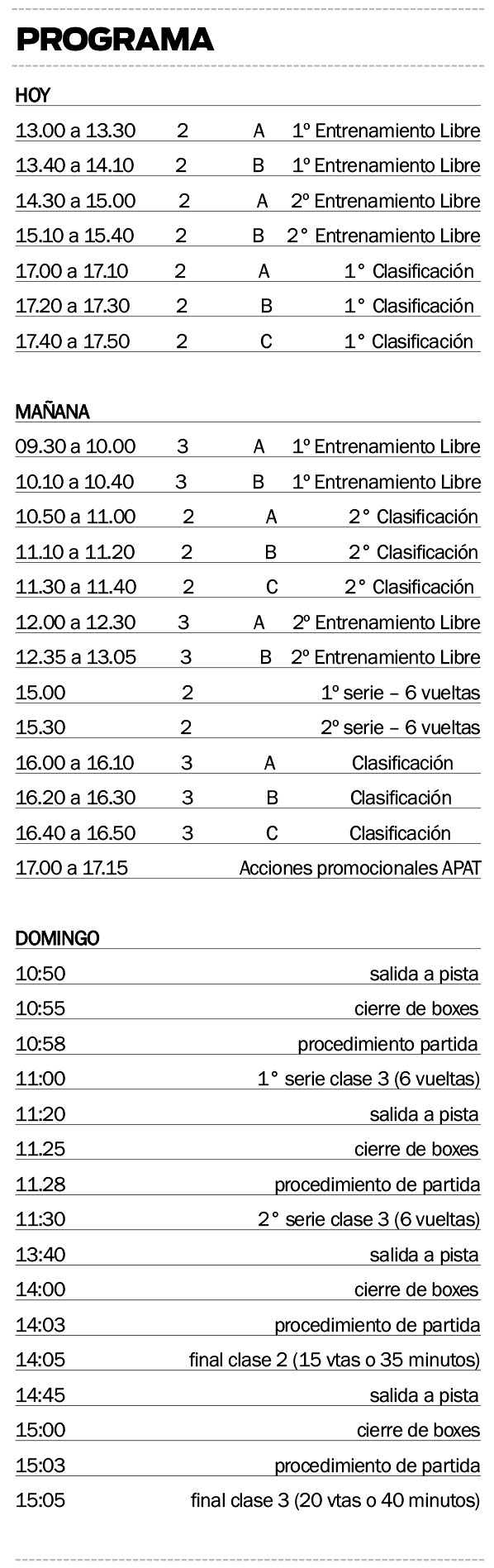 De acuerdo al programa, este sábado habrá entrenamientos y la clasificación definitiva de la Clase 2. La primera serie será a las 15 y la segunda fue programada a partir de las 15.30.