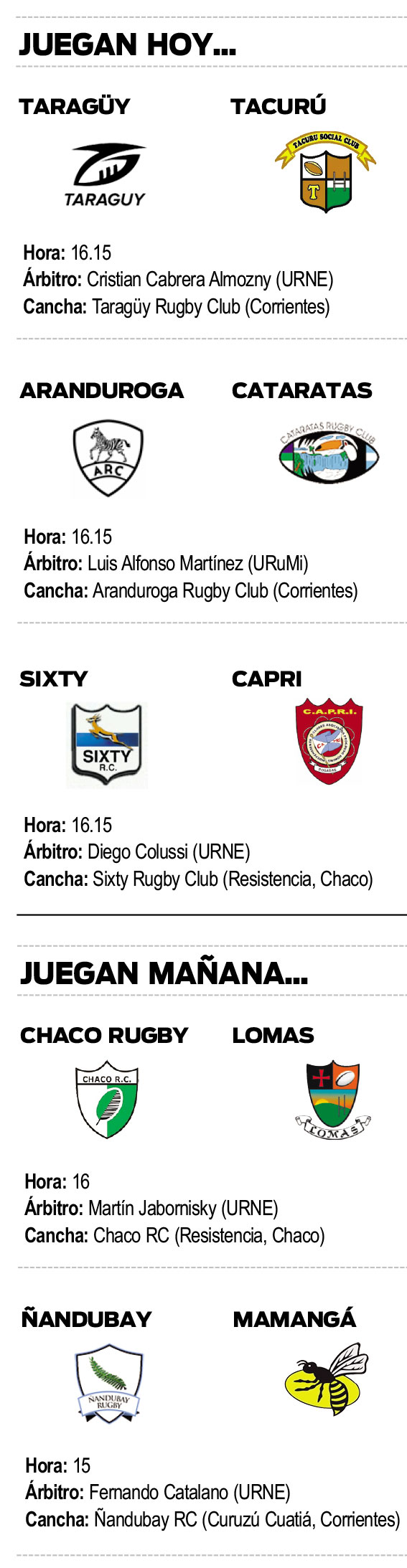 En la zona A estarán Centro de Cazadores, Caza y Pesca, Chajá y Asociación Italiana, mientras que en la B jugarán Lomas, Chaco Rugby, Pay Ubre y Aborigen.