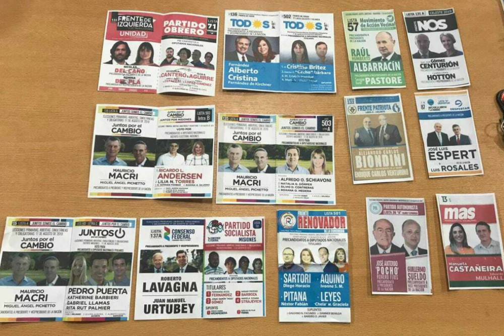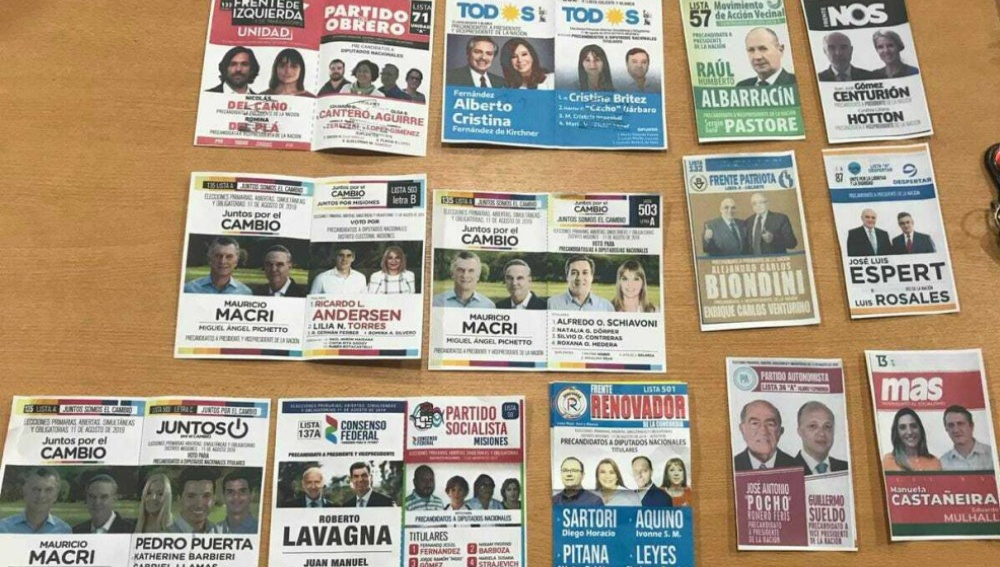 Las seis boletas con fórmulas presidenciales que estarán sueltas son: José Luis Espert y Luis Rosales (Frente Despertar); Juan José Gómez Centurión y Cynthia Hotton (Frente NOS); Alejandro Biondini y Enrique Venturino (Frente Patriota); José Antonio “Pocho” Romero Feris y Guillermo Sueldo (Partido Autonomista); Raúl Albarracín junto a Sergio Pastore (Movimiento de Acción Vecinal) y Manuela Castañeira y Eduardo Mulhall (Nuevo MAS).