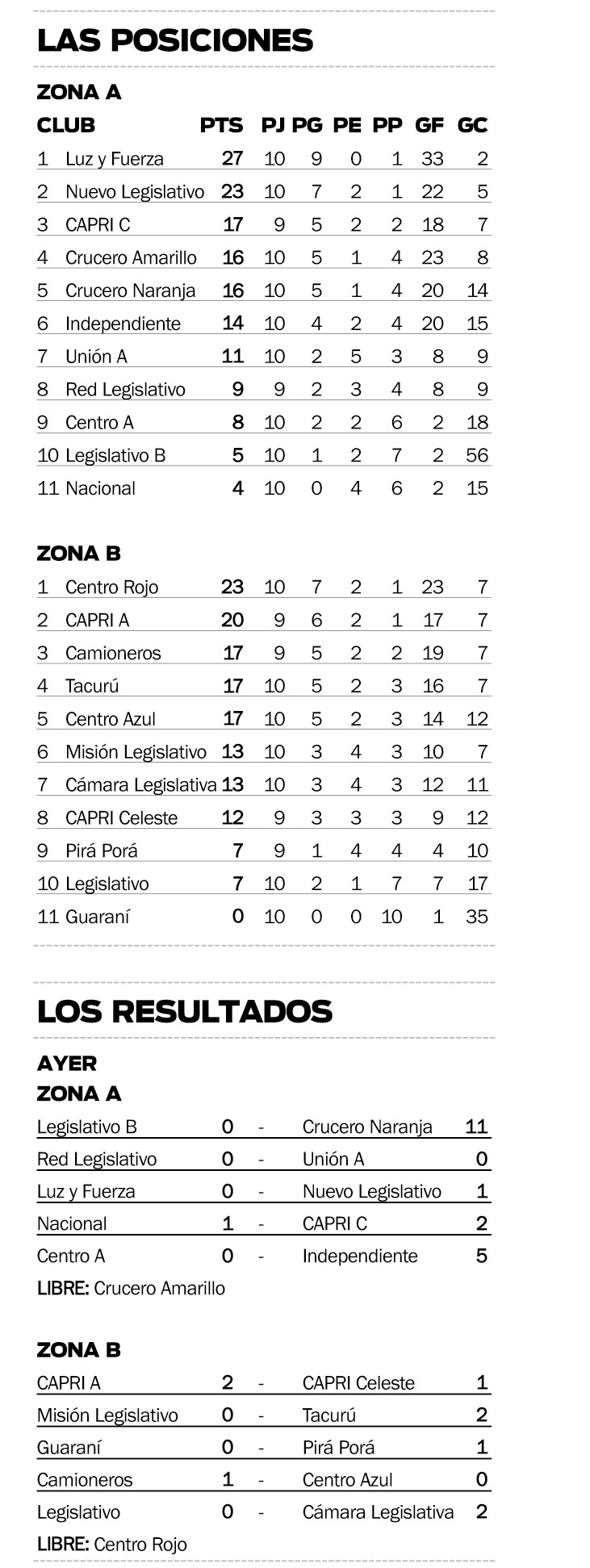 En otros resultados de la zona Independiente le hizo cinco a Centro A y Red Legislativo y Unión A empataron 0-0.
