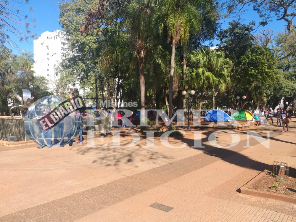 Volvieron las carpas a la plaza 9 de Julio. Desde esta mañana, un grupo de tareferos de la zona Centro y alrededores llegó hasta Posadas para reclamar por trabajo, tierra, asistencia a los merenderos y herramientas.