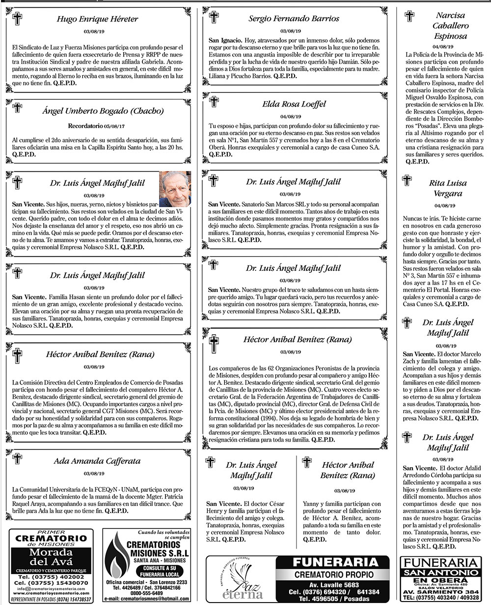 Fúnebres del lunes 5 de agosto de 2019