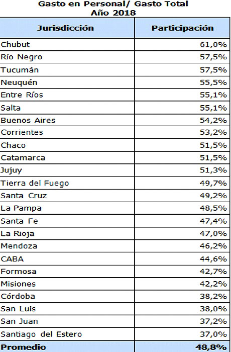 Hay grandes discrepancias entre jurisdicciones de los dos extremos: por ejemplo en Chubut el gasto en personal representa el 61% de sus erogaciones mientras que en Santiago del Estero alcanza el 37%.