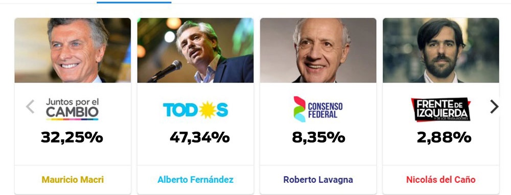 Con el 88,17% de las mesas escrutadas, el candidato a presidente por el Frente de Todos, Alberto Fernández, obtiene el 47,34% de los votos por sobre el 32,25% de Mauricio Macri, de Juntos por el Cambio, y el 8,35% de Roberto Lavagna, de Consenso Federal, en las Primarias Abiertas Simultáneas y Obligatorias (PASO).