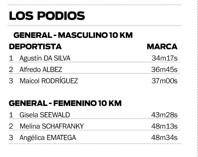 En la general masculina se impuso Agustín Da Silva, quien llegó primero con un tiempo de 34 minutos y 17 segundos. Alfredo Albez llegó segundo, un par de minutos después; y el tercero fue Maicol Rodríguez, con un tiempo de 37 minutos. En el caso de la general femenina, la primera fue Gisela Seewald, con un tiempo de 43 minutos y 28 segundos. Gisela es la actual campeona del circuito Misiones Corre 2018. Melina Schafranky fue segunda con un tiempo de 48m13s y tercera llegó Angélica Ematega, apenas 30 segundos después.
