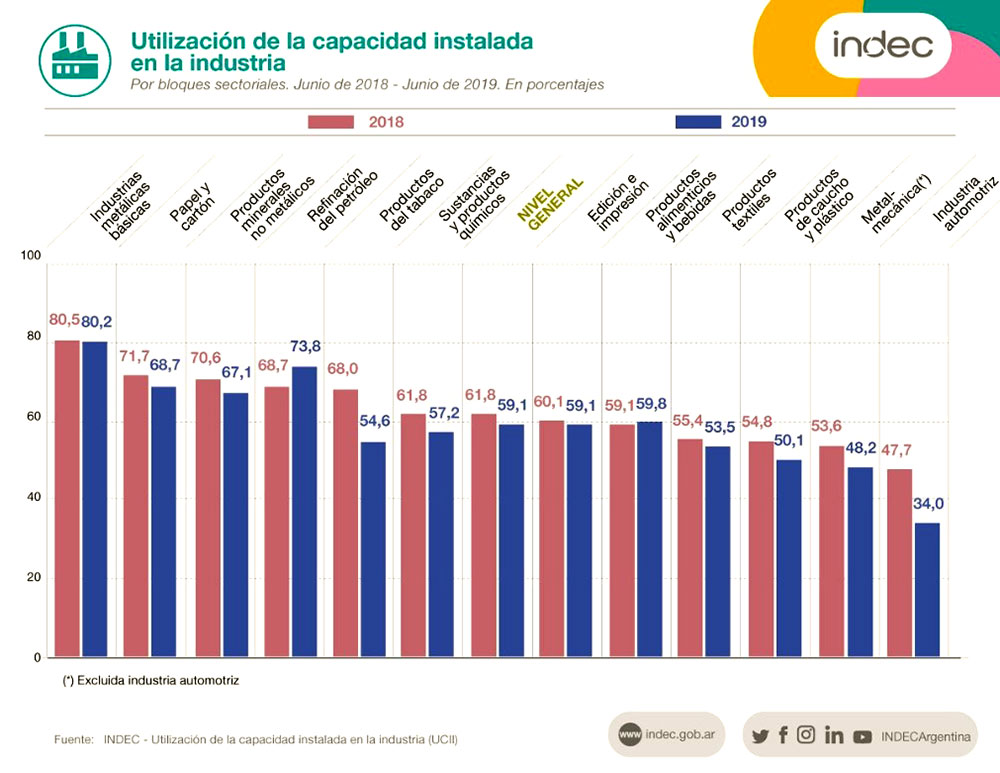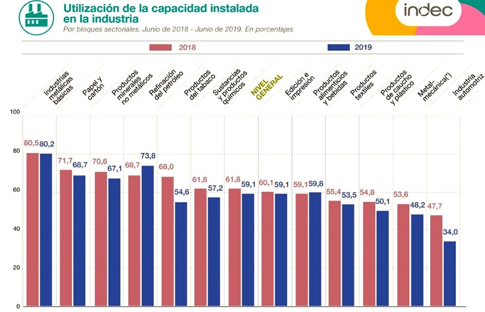 La industria metalmecánica excepto automotores presenta un nivel de utilización de la capacidad instalada de 48,2%, menor al registrado en junio de 2018 (53,6%), como consecuencia principalmente de los menores niveles de producción de maquinaria agropecuaria y aparatos de uso doméstico.