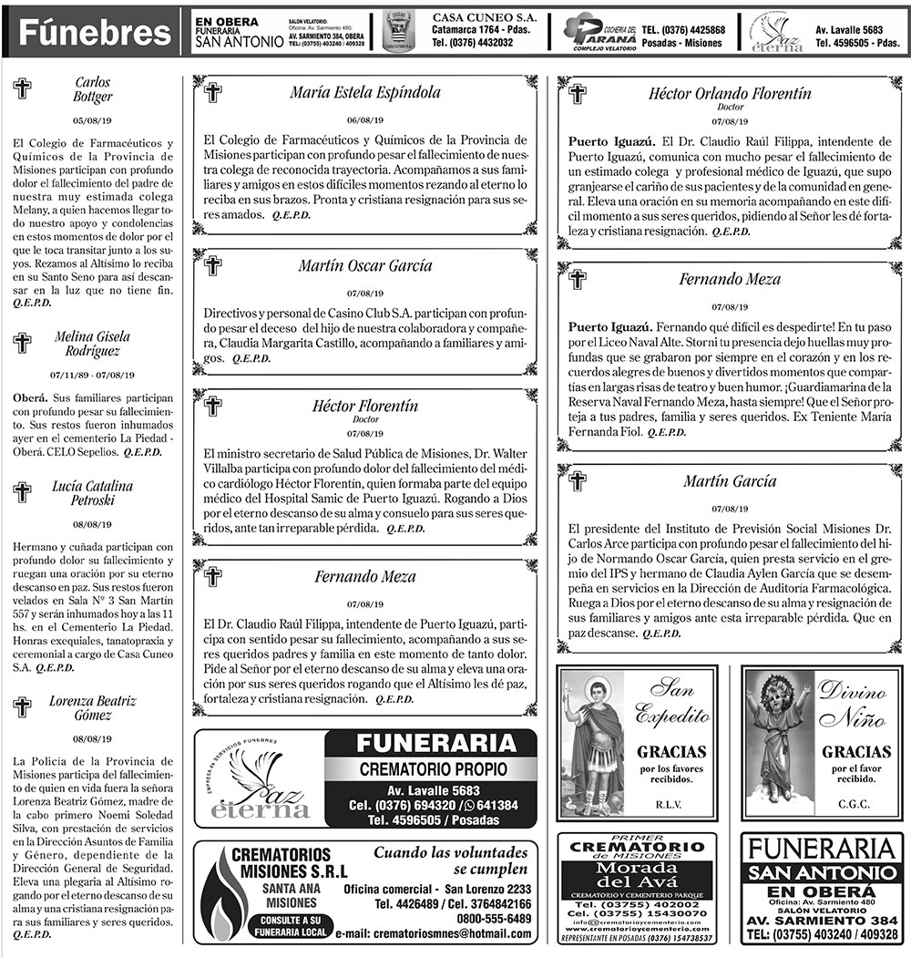Fúnebres del viernes 9 de agosto de 2019