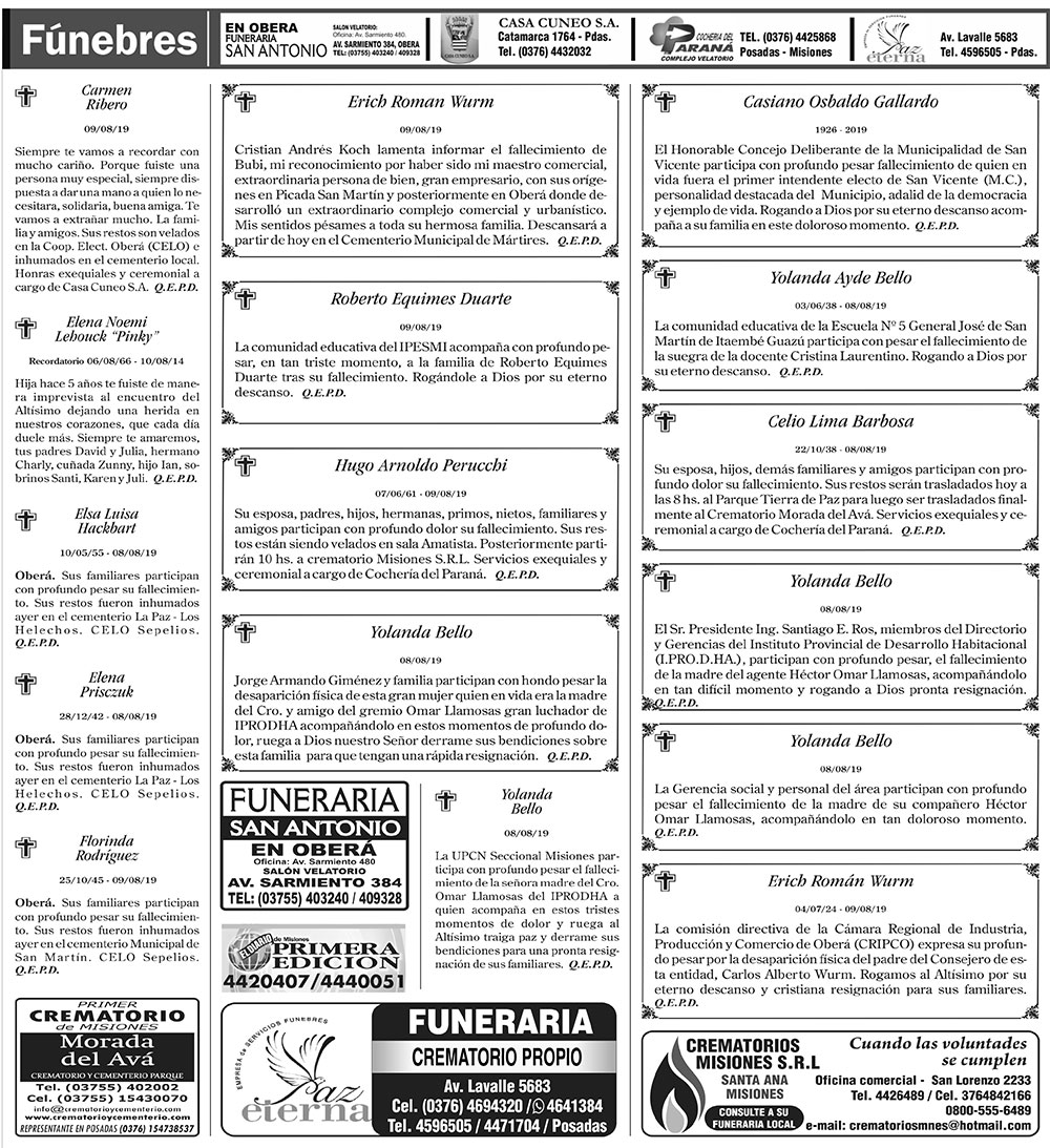 Fúnebres del sábado 10 de agosto de 2019