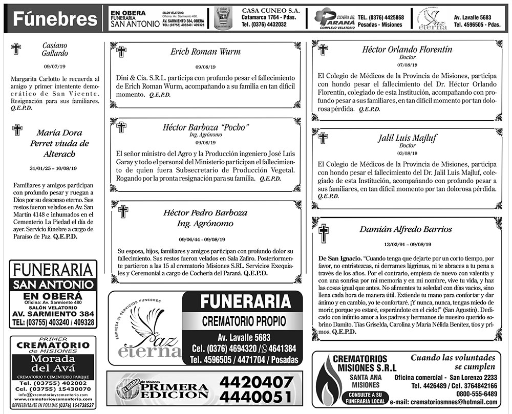Fúnebres del domingo 11 de agosto de 2019