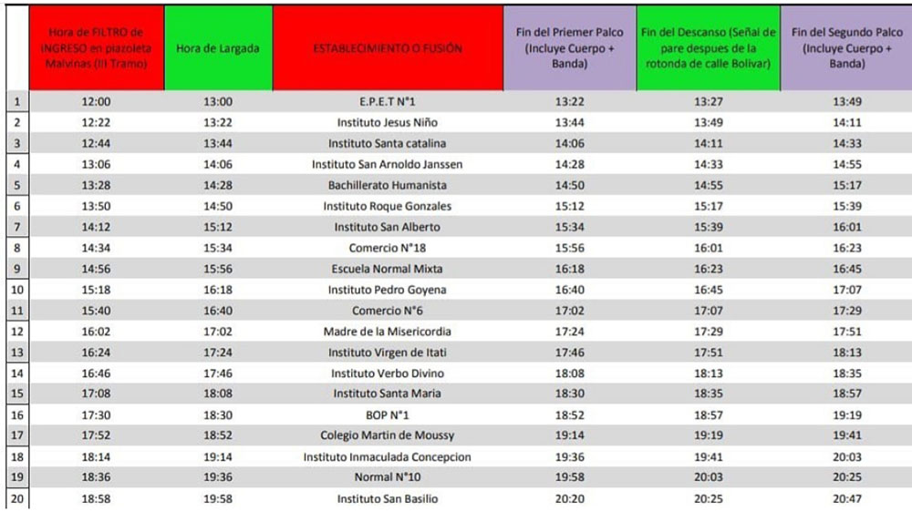 La Asociación Posadeña de Estudiantes Secundarios, a través de su cuenta de Facebook, informó que al filtro que estará ubicado en entre Avenida Roque Pérez y costanera hasta la Iglesia Stella María, únicamente podrán ingresar los estudiantes que participarán del desfile, mientras que quienes los acompañen podrán ingresar por la calle Esteban Benítez, continuación Sarmiento.