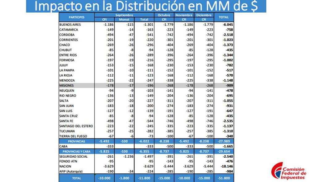 Es que la Nación disminuirá su recaudación en tres componentes impositivos que se coparticipan a las provincias: Ganancias, Monotributo y el IVA (Impuesto al Valor Agregado). Recortando la recaudación, el monto que se reparte a las provincias por coparticipación caerá. El total que dejarán de recibir las 24 jurisdicciones asciende a 51.800 millones de pesos hasta diciembre.