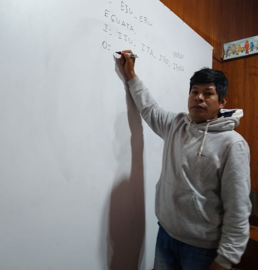 El curso de “Trayecto profesional de agente en preservación y fiscalización de bosques nativos”, que se dicta en el IMES de San Vicente retomó las clases días atrás. La primera materia del día es idioma y le toca al guaraní. El profesor es Pedro Olivera, de la comunidad Mbya. Pertenece a la aldea Yeyi, en la Biosfera Yabotí, y dicta clases como Docente Auxiliar Indígena en la Escuela Nº 651 de la aldea Ivirayti, de San Vicente. Además, es un apasionado por su idioma y se dedica a investigar y recuperar términos y vocablos que están prácticamente en desuso en sus comunidades.