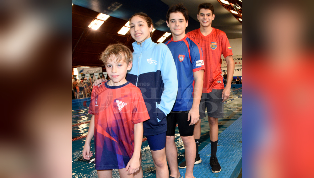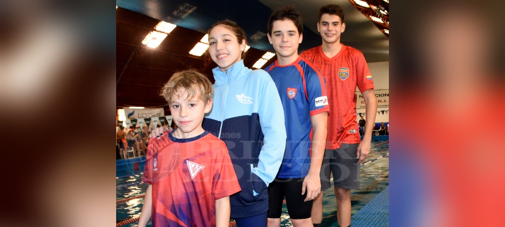 PURA AMISTAD. Emi Castagnello (Villa Ballester), Sofía Gazán (All Boys), Ian Duarte (Capri) y Facu Gamón (Encarnación), ayer, en plena competencia. Cuatro latitudes representadas en la pileta.