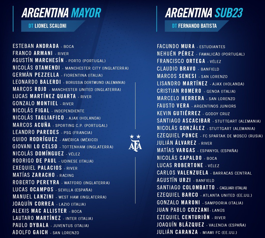 Los convocados son: Julián Álvarez y Ezequiel Centurión (River Plate), Claudio Bravo y Agustín Urzi (Banfield), Marcos Senesi y Marcelo Herrera (San Lorenzo), Santiago Ascacibar y Nicolás González (Stuttgart, Alemania).